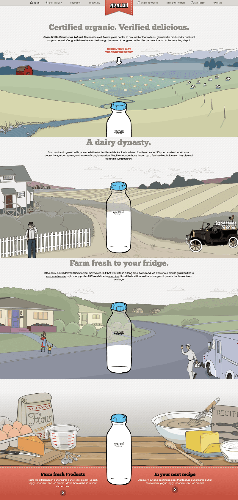 We wanted an approachable and hand-drawn feel for the Avalon Milk homepage, recognizing their family focused, local brand and products.